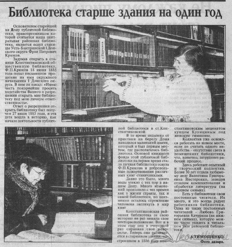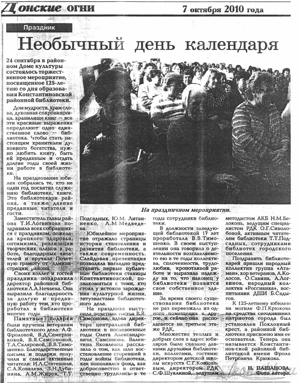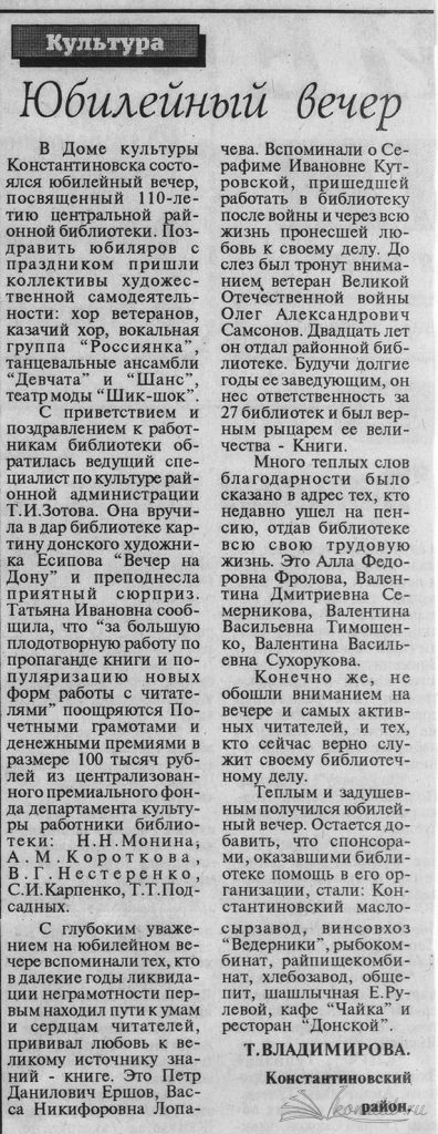 В 1995 году в Доме культуры Константиновска состоялся юбилейный вечер, посвященный 110-летию центральной районной библиотеки, о чем и написала районная газета «Донские огни» 1.10.1995 г.: