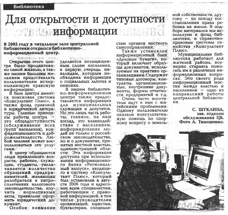 «Муниципальная библиотека работает для жителей района, всемерно стараясь помогать им в различных информационных вопросах. Это своего рода информационный мостик между властью и населением — одно из направлений работы центральной библиотеки.» — сообщает газета «Донские огни» в номере за 27.05.2005 г.