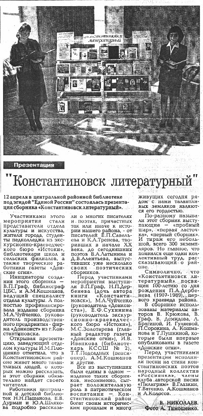 12 апреля 2007 года в центральной районной библиотеке состоялась презентация сборника «Константиновск литературный», в который включены авторы- жители нашего города, о чем нам и сообщает газета «Донские огни» в статье за 14.04.2007 года.