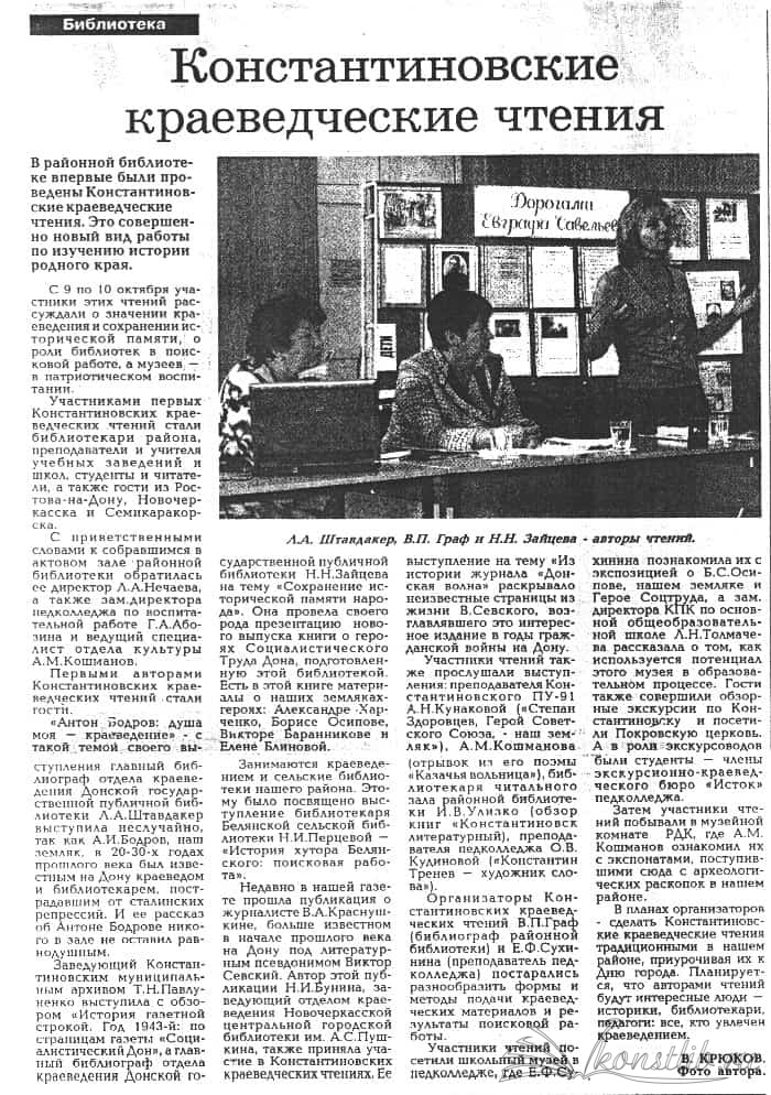 Они состоялись благодаря методической помощи Отдела краеведения Донской государственной публичной библиотеки. Организаторы чтений Граф В.П и Сухинина Е.Ф. постарались разнообразить формы и методы подачи краеведческих материалов и результаты поисковой работы, о чем и говорит статья в районной газете «Донские огни» от 30.10.2008 года.