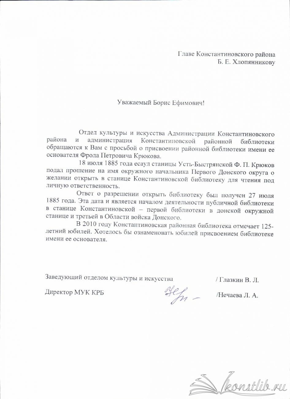 В ознаменование 125-летия библиотеки, как дань истории и в благодарность основателю библиотеки, в 2010 году был подан запрос главе Администрации Константиновского района о присвоении библиотеки имени Фрола Петровича Крюкова.