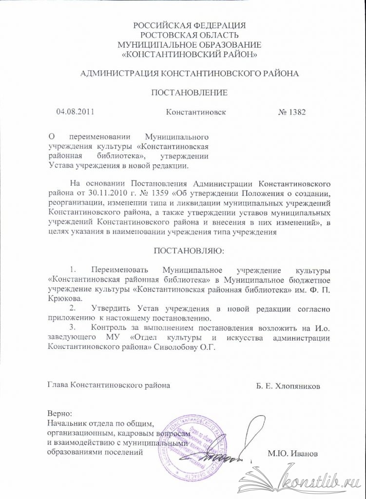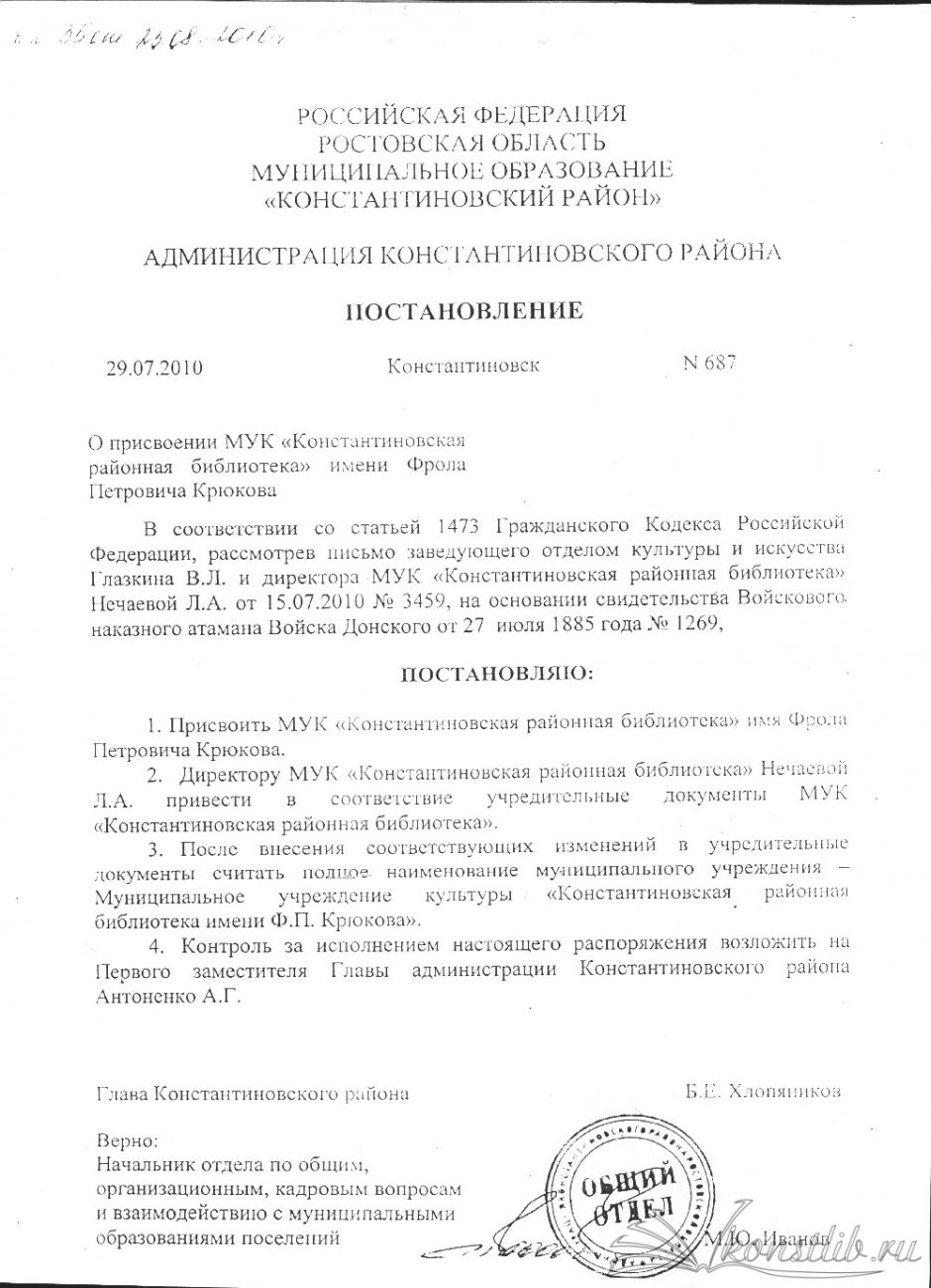 А в 2011 году Постановлением Администрации района от 4.08.2011 №1382, библиотека была переименована в «Муниципальное бюджетное учреждение культуры «Константиновская районная библиотека» им. Ф.П. Крюкова», как наименуется и по настоящий день.