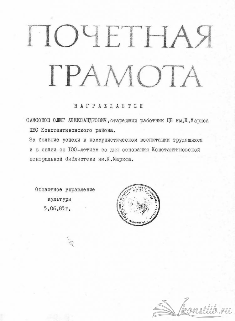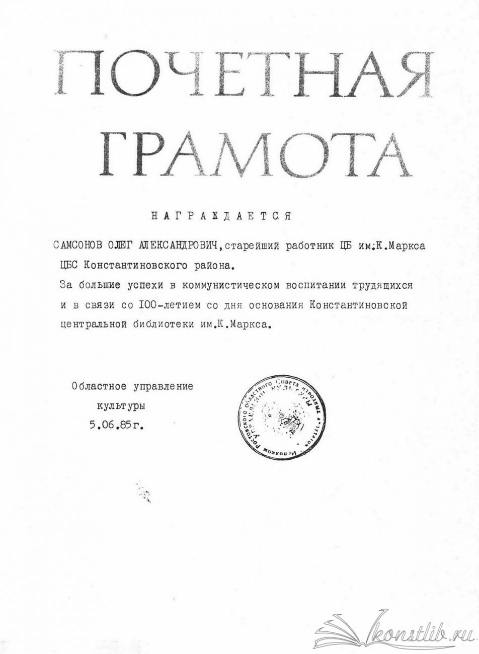 По итогам работы за 2004 год, методико — библиографический отдел Константиновской районной библиотеки был награжден Почетной грамотой отдела культуры — «За организацию методической деятельности, за введение в работу новых профессиональных знаний, изучение, обобщение и внедрение интересных форм и методов в практику работы сельских библиотечных филиалов».