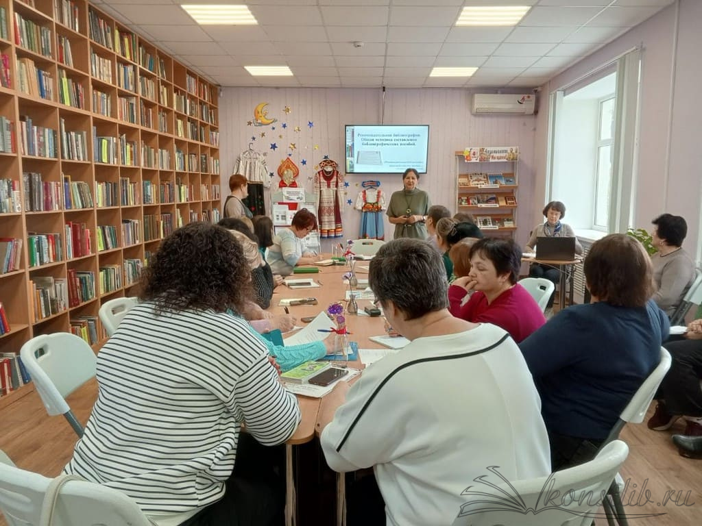 К выступлению библиографа была подготовлена презентация «Рекомендательная библиография. Общая методика составления библиографического пособия». Также для повышения библиографических знаний библиотекарей района подготовлена методическая консультация с одноименным названием, она размещена на сайте МБУК КРБ в разделе «Специалисту» — «Материалы семинаров» https://konstlib.ru/menu/materialy-seminarov